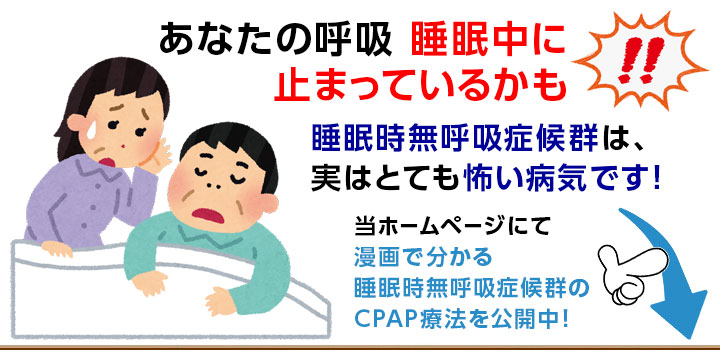 当院監修による「睡眠時無呼吸症候群治療ガイド」を開設致しました。日中に眠気を強く感じる方、ご家族にいびき、夜間息が止まっているなどの指摘を受けたことのある方は、ぜひ「睡眠時無呼吸症候群治療ガイド」をご覧下さい。