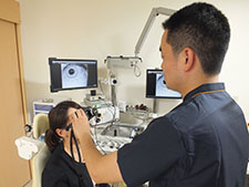 具体的には赤外線眼鏡で眼球の動きを調べます。当院ではCCDカメラ付きの検査機器を導入しておりますので、大画面モニターに眼球の動きを拡大して映し出し、詳細に観察することが可能です。